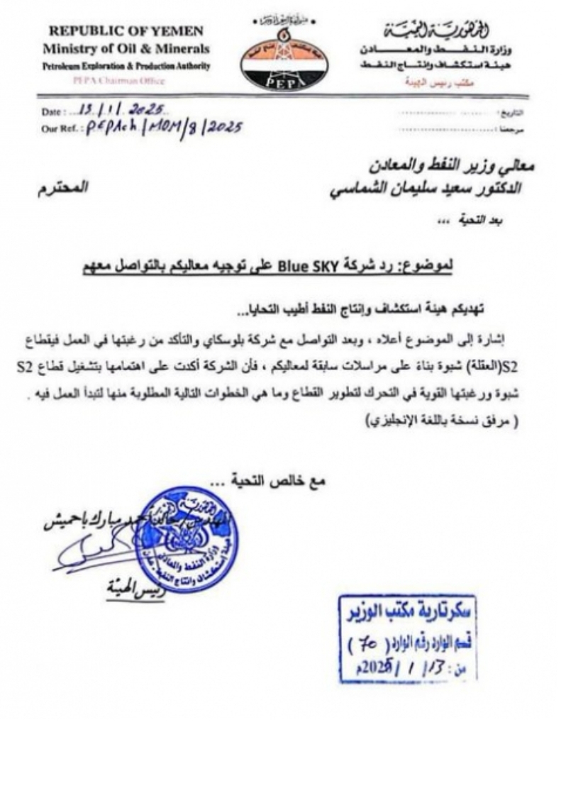 في خطوة أثارت الكثير من علامات الاستفهام، تسلّمت شركة “بلو سكاي” – المملوكة لنجل عضو مجلس القيادة –(عبدالحافظ رشاد العليمي) تشغيل قطاع S2 النفطي في العقلة بمحافظة شبوة، بعد انسحاب شركة OMV النمساوية بشكل نهائي قبل ستة أشهر، تاركة وراءها منشآت ومعدات كان يُفترض أن تنتقل ملكيتها للدولة بحسب نص القانون اليمني.