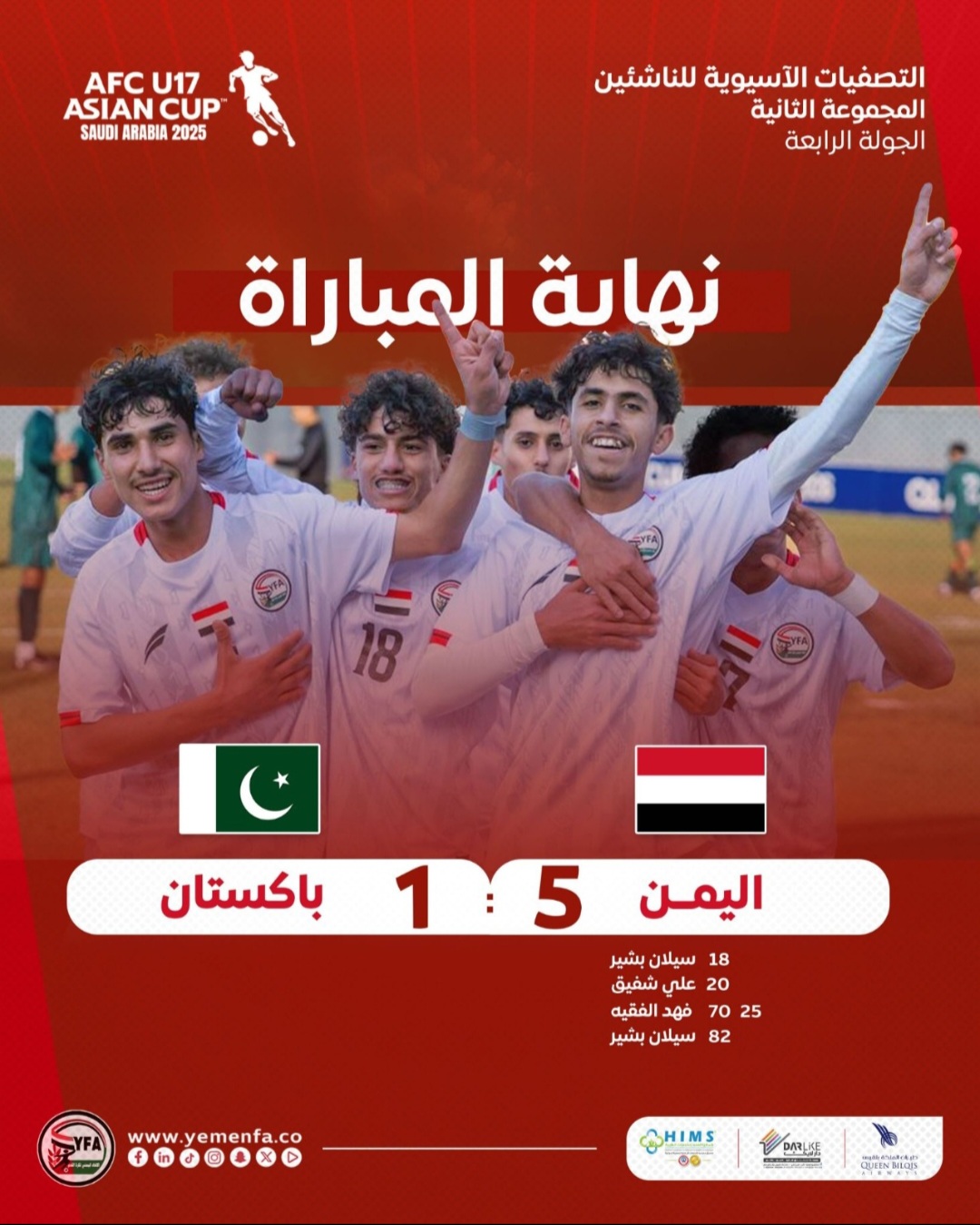 حقق منتخب اليمن للناشئين انتصارًا عريضًا على نظيره الباكستاني بنتيجة 5 – 1، في المباراة التي جمعتهما ضمن التصفيات المؤهلة لنهائيات كأس آسيا تحت 17 عامًا، مواصلًا عروضه القوية التي تعزز حظوظه في خطف بطاقة التأهل.