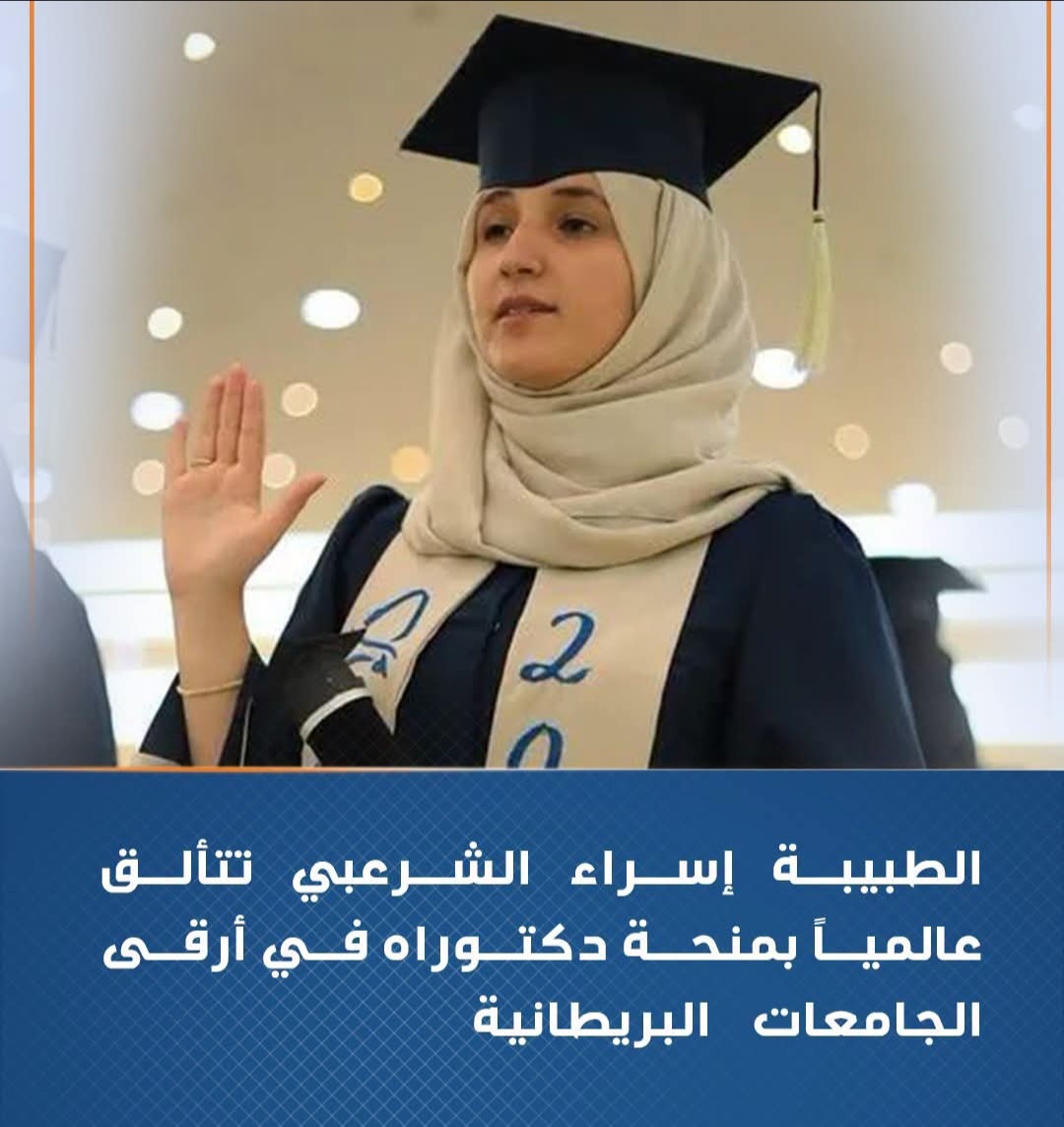 في إنجاز أكاديمي يعزز حضور الكفاءات اليمنية في المحافل الدولية، حصلت الطبيبة اليمنية إسراء وهيب الشرعبي على منحة دراسية لدراسة الدكتوراه ضمن برنامج أكاديمي مشترك بين St George’s, University of London وLondon School of Hygiene & Tropical Medicine، وهما من أبرز المؤسسات العالمية الرائدة في مجالي التعليم الطبي والبحث العلمي.